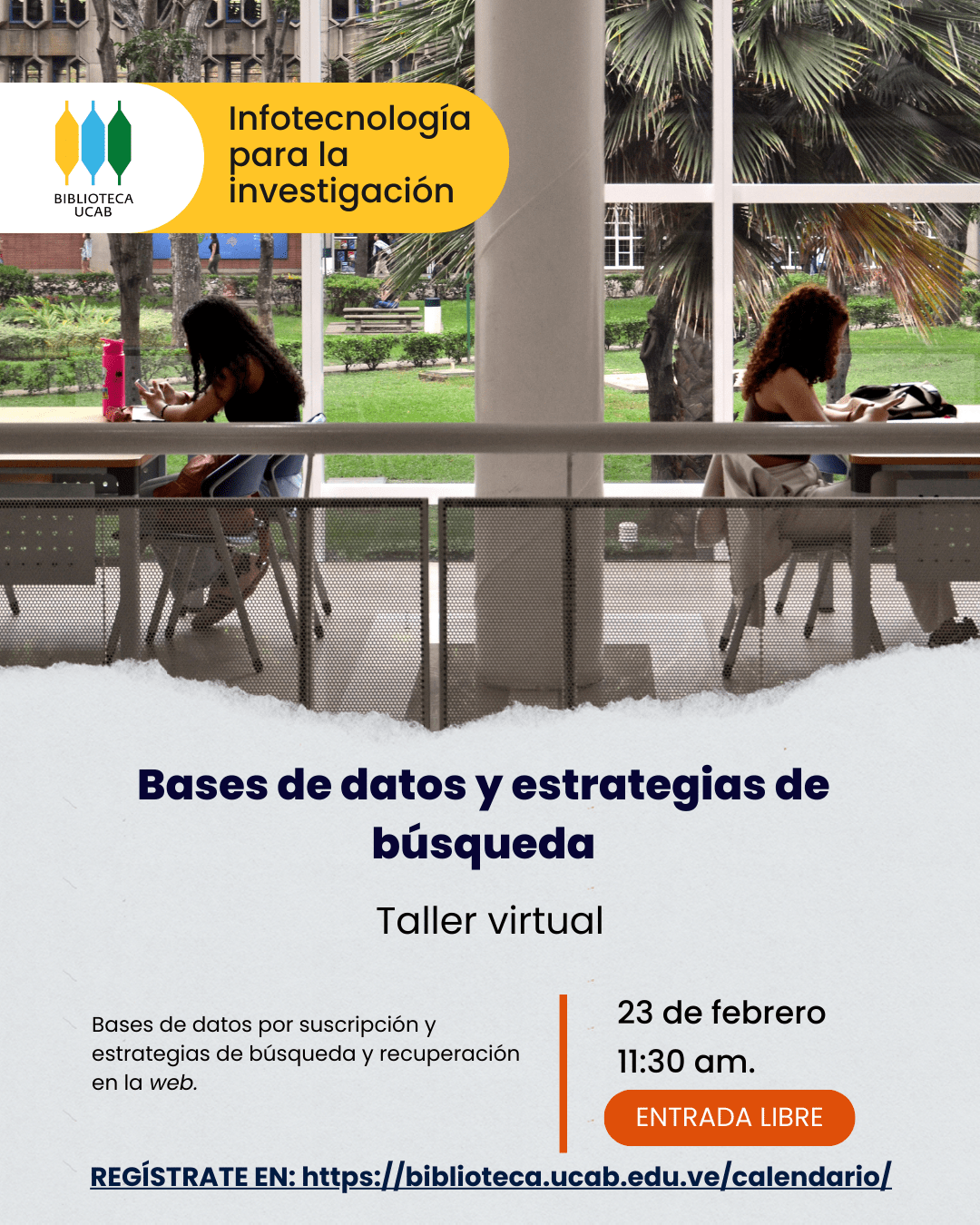 Aprende a utilizar las bases de datos institucionales con Paoly Gamboa, referencista de la Biblioteca UCAB📚 📅 Lunes 23 de febrero a las 11:30 am 💻 Vía Google Meet: meet.google.com/fxe-vdsg-zgx